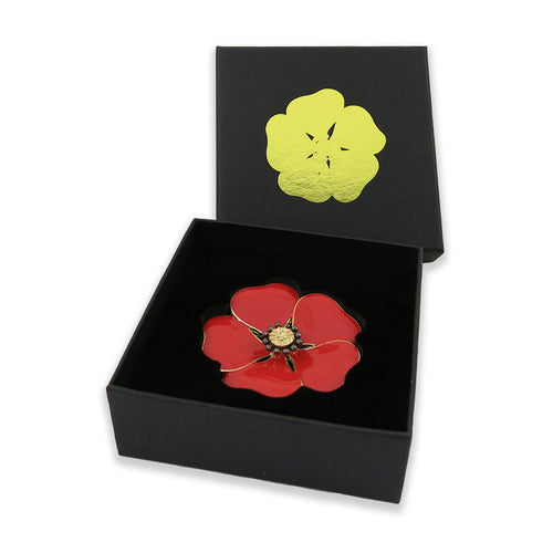 Finished in striking red and gold tones, the brooch can be fastened to your lapel with a rolling safety clasp. The brooch is presented in a classic black gift box.