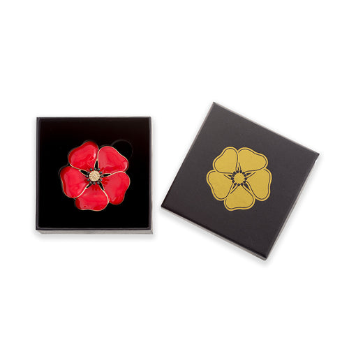 Finished in striking red and gold tones, the brooch can be fastened to your lapel with a rolling safety clasp. The brooch is presented in a classic black gift box.