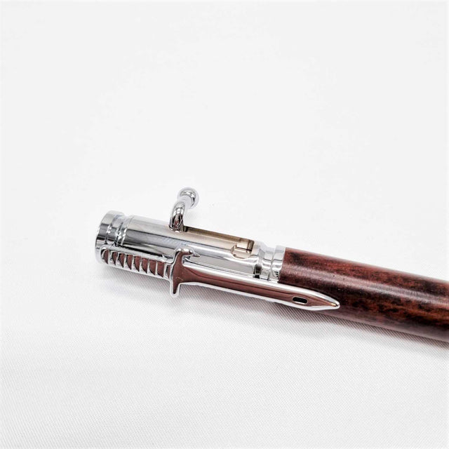 Crafted from Australian Jarrah with chrome accents, this unique pen features a bullet-style nib and bayonet-shaped pocket clip. The pen is designed to click open with the bolt-action mechanism - echoing the form and function of an Australian Defence Force Austeyr rifle - which in turn releases the nib.