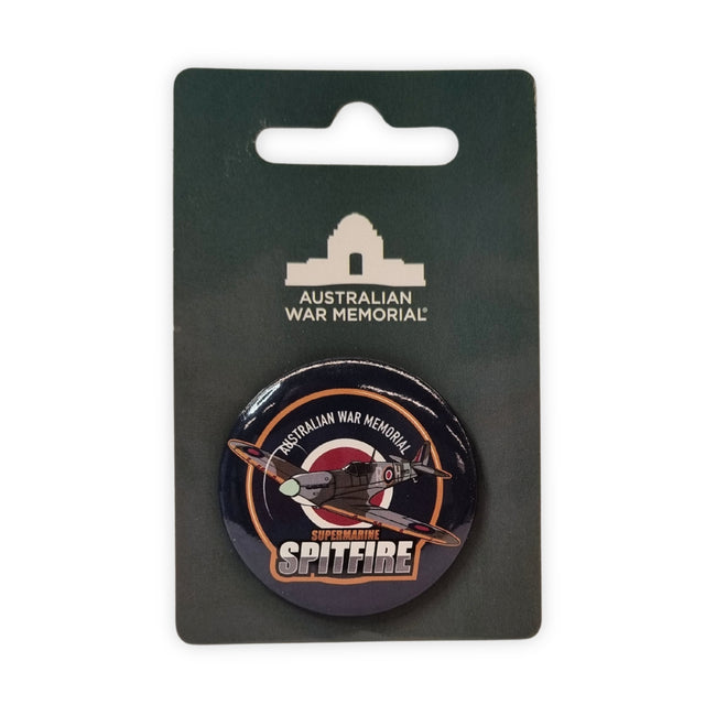 This button badge features a roundel design, inspired by nose art, of the Supermarine Spitfire, a fighter aircraft used by the Royal Australian Air Force and allied forces during the Second World War.