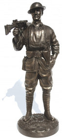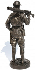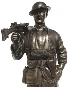 Cold-cast bronze First World War figurine, 1st AIF Lewis Gunner, France 1918. Typical of an Australian platoon machine-gunner on the Western Front, Roy carries his Lewis .303 calibre machine-gun, Webley & Scott .45 calibre revolver and wears pattern 08 pistol rig equipment in battle order. He also wears a Brody steel helmet and carries his small box respirator gas mask slung around his neck in ready position.