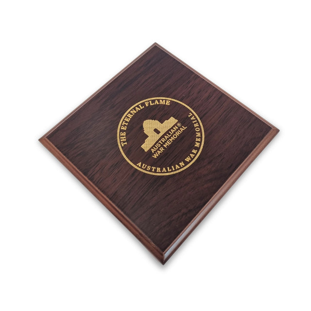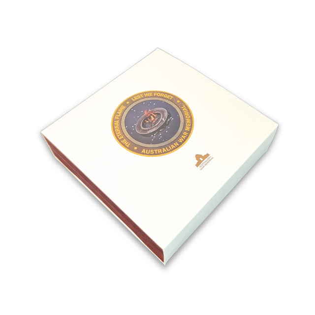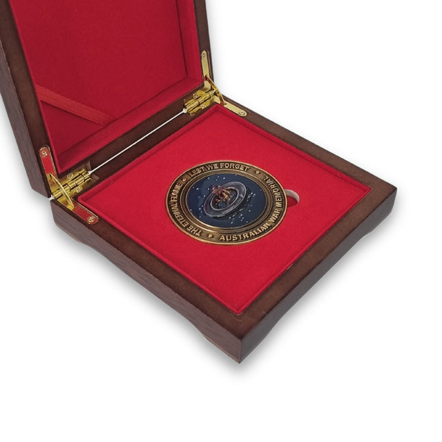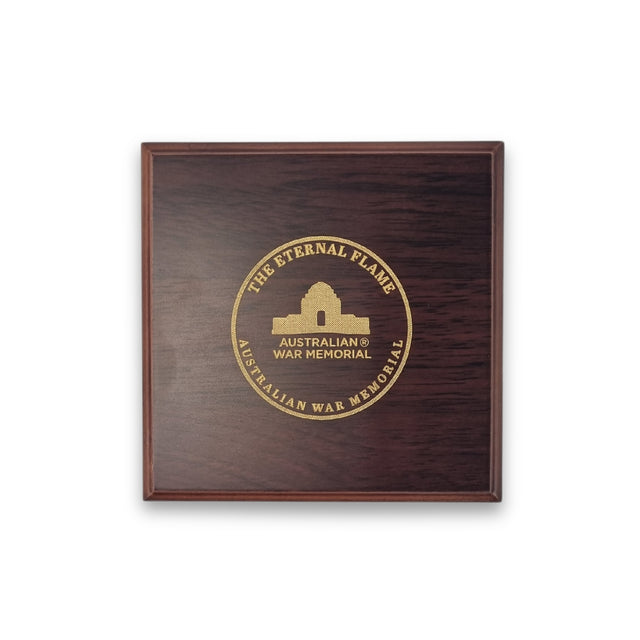 Meticulously crafted, the medallion's obverse features a detailed bas relief depiction of the Eternal Flame, encircled by the words "The Eternal Flame - Lest We Forget - Australian War Memorial"; while the reverse features the Commemorative Area at the Australian War Memorial. Each medallion is finely detailed and expertly finished in an antique gold tone with coloured highlights. The medallion is handsomely presented in a timber gift box, lined in red velvet with laser-etched lid (hinged).