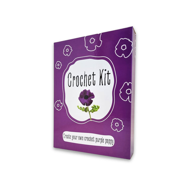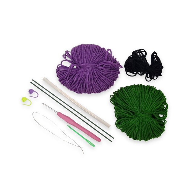 - Kit includes: acrylic yarn (purple, green, black), crochet hook, flower rod x 2, iron wire, hot melt adhesive, stitch markers, darning needle and full instruction booklet.