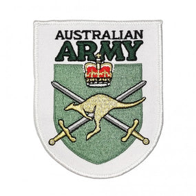This cloth patch is based upon an Australian Army emblem, featuring a gold kangaroo in motion, atop a pair of crossed swords, with a crown hovering overhead. The shield-shaped patch is fully embroidered and can be affixed to most fabrics thanks to the heat-activated ("iron-on") adhesive on the reverse side.