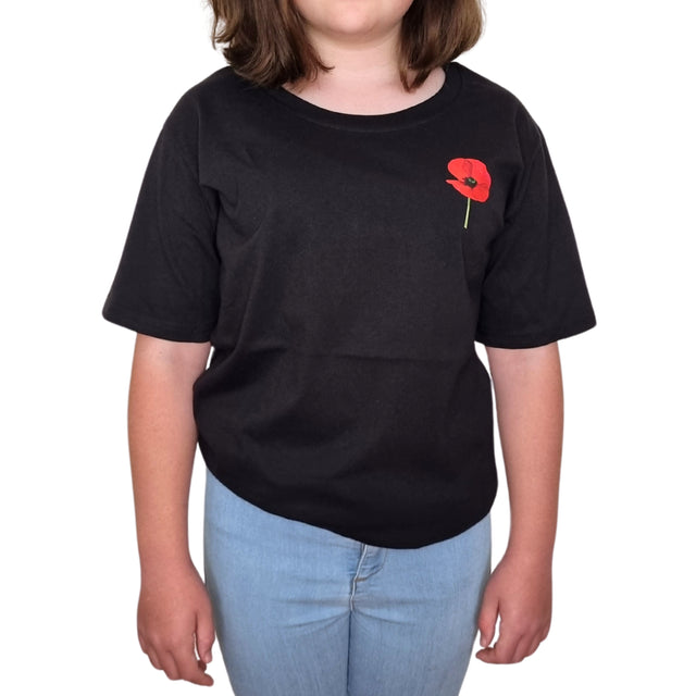 Classic and commemorative. This ladies t-shirt features a single poppy, reminiscent of a tribute poppy worn on the lapel for commemorative occasions.