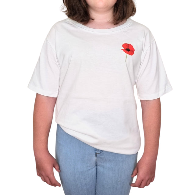 Classic and commemorative. This ladies t-shirt features a single poppy, reminiscent of a tribute poppy worn on the lapel for commemorative occasions.